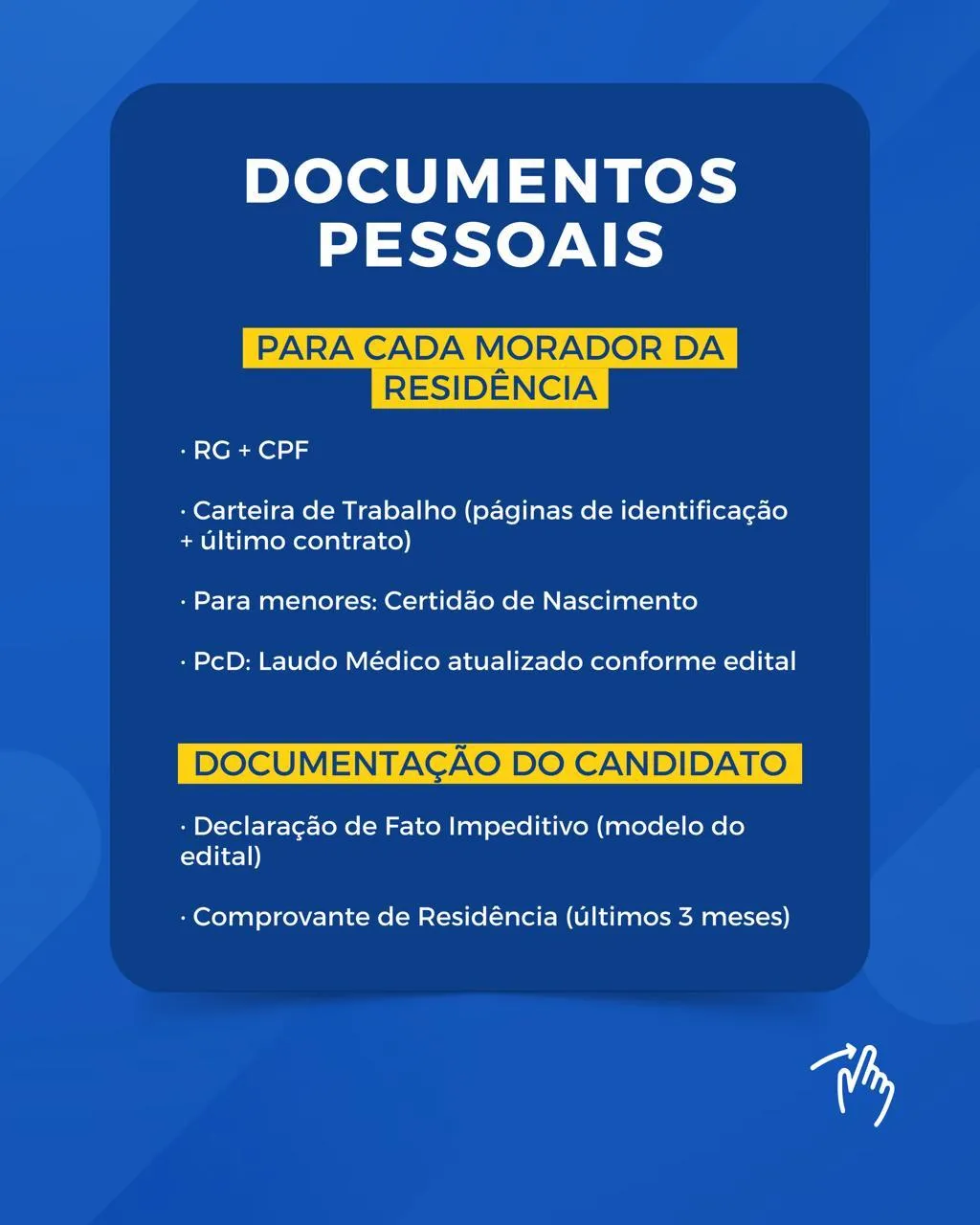 - Documentos obrigatórios para o candidato e TODOS os moradores da mesma residência;