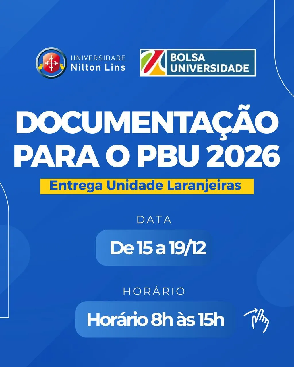 A entrega de documentação será realizada no Hall da Universidade Nilton Lins Parque das Laranjeiras(Parque das Laranjeiras, Av. Prof. Nilton Lins, 3259 - Flores, Manaus - AM), entrada pela Central de Atendimento no prédio Unicenter.