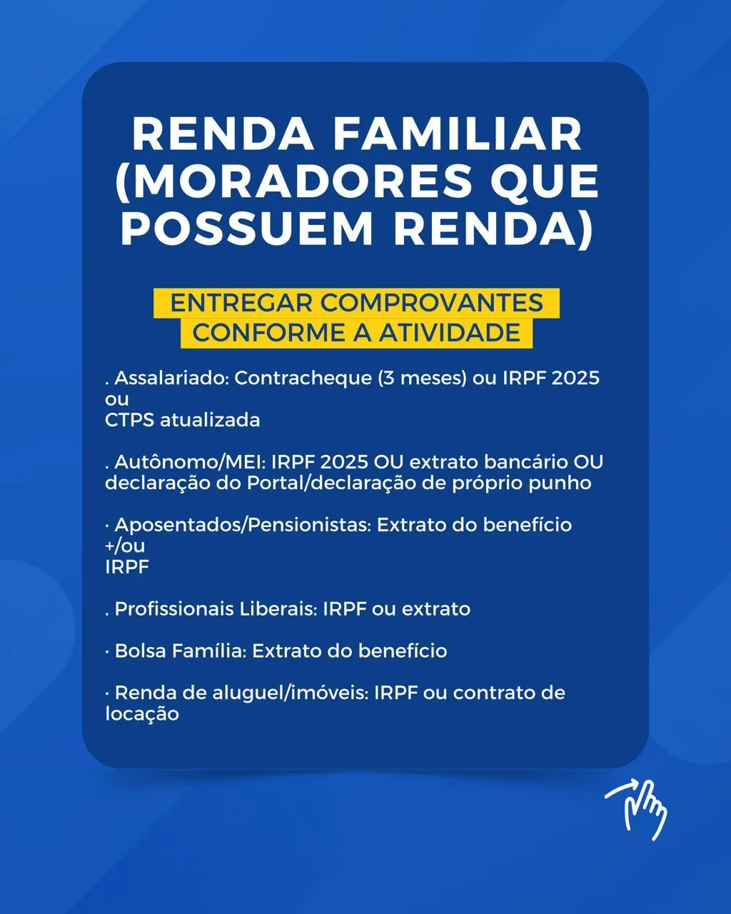 - Empregado Assalariado: Contracheque (emitido há no máximo 3 meses) OU Declaração de IRPF 2025 com recibo de entrega à Receita Federal OU Cópia da CTPS com dados atualizados há pelo menos 3 meses